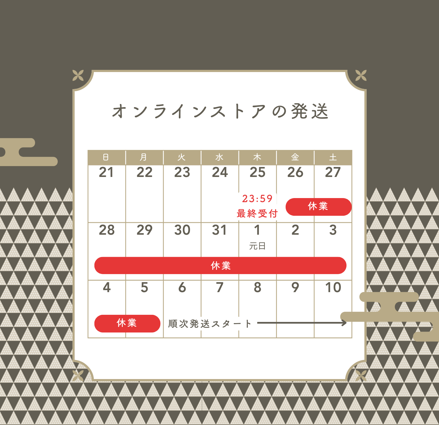 本日は、年末年始の「オンラインストア発送」および「実店舗の営業」スケジュールをお知らせいたします。