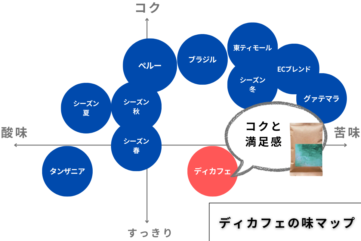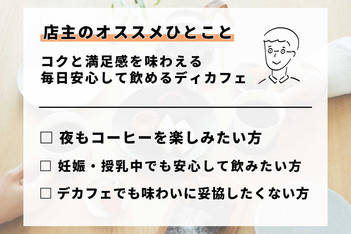 デカフェは通常のコーヒーと比べて“風味が劣る”といったイメージが強いですが、“しっかりコーヒーを飲んでる満足感と毎日飲めるスッキリさ”を意識して作りました。