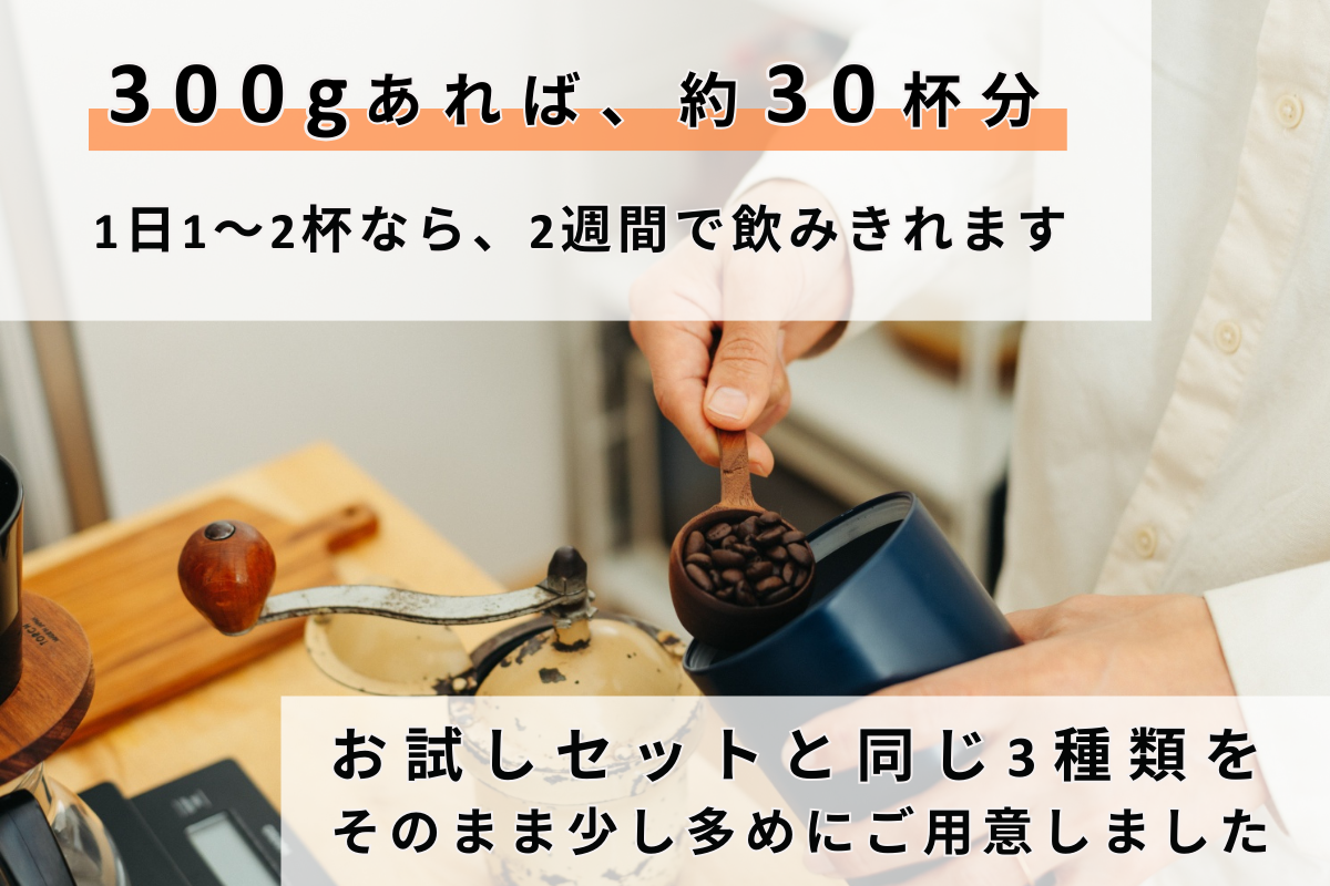 このセット(100g × 3種)であれば、合計300g。つまり30杯分お楽しみいただけます。
