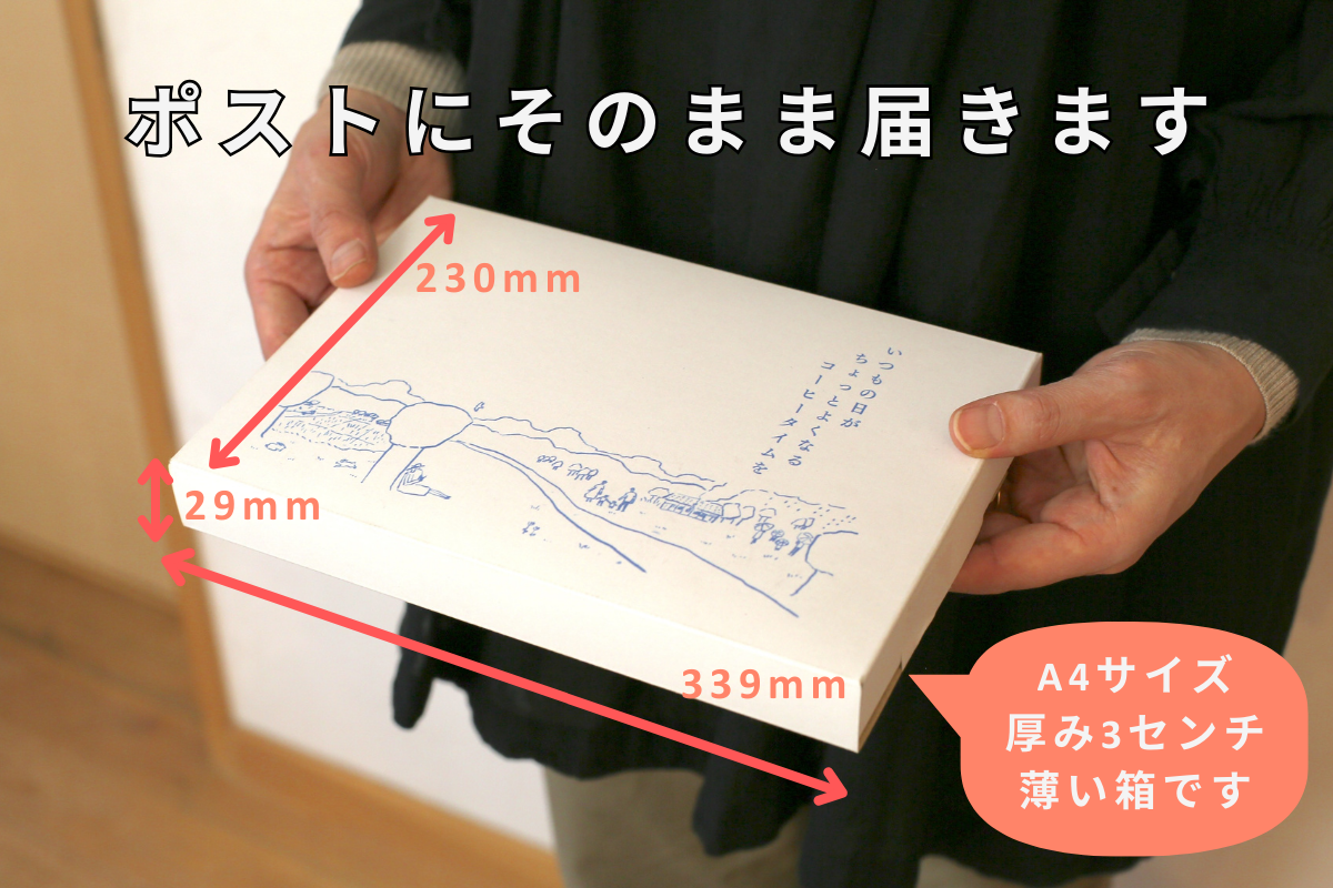 A4サイズ厚み3センチの薄型ダンボールで発送するので、お客様のポストにお届けします。