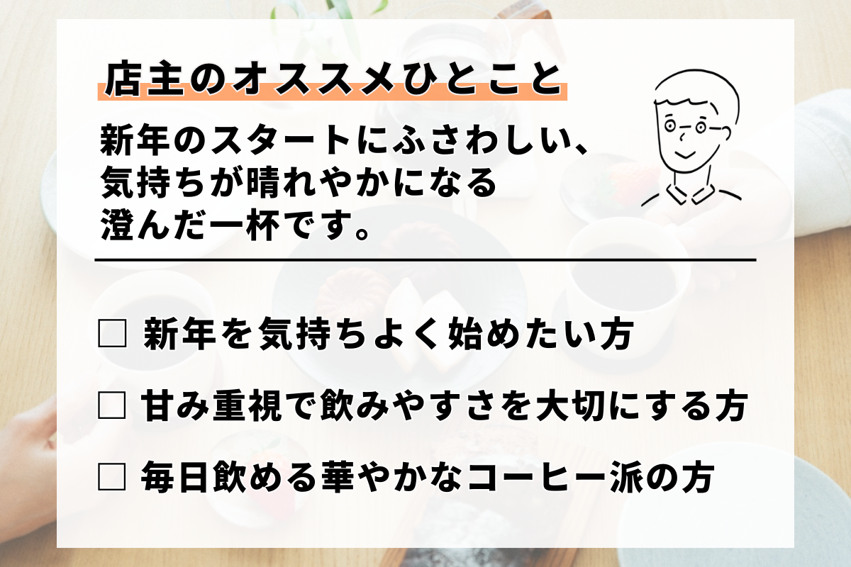 新しい1年もみなさまにとって晴れやかで、そして感動するコーヒーと出会えることを願ってこのニューイヤーブレンドをつくりました。