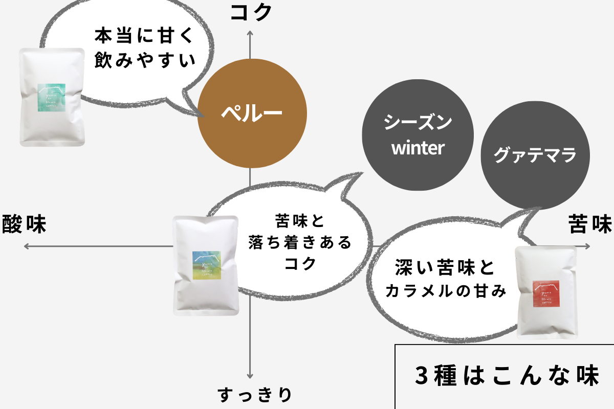 3種類のコーヒーを飲みくらべることで、 あなたの“好きな味”がきっと見つかります。